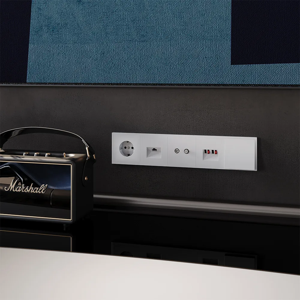 Розетка полностью совместима с пластиковыми и стеклянными рамками той же серии и гармонично вписывается в любые композиции из электрических розеток, выключателей и мультимедийных устройств VOLTUM S70.